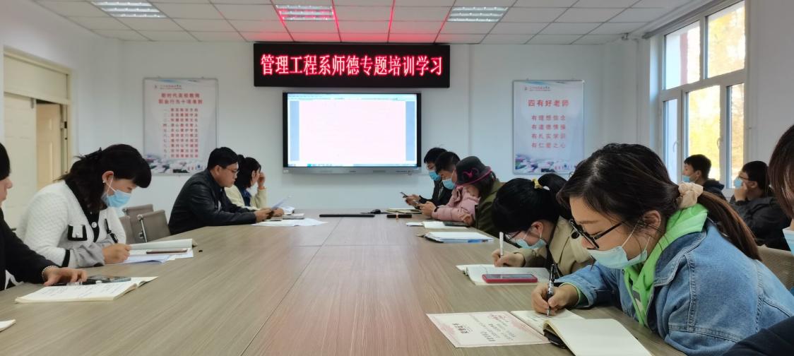 10月12日下午,在二号教学区2209会议室,管理工程系开展师德师风专题培训会。张洪岩副主任组织全体教职工深入学习《j9在线教师师德失范行为督查及处理办法(试行)》文件精神,要求教职工从教育教学、学术道德、等方面加强师德师风建设。王丹主任强调,教师在工作中严格要求自己,不能有师德失范行为。通过此次学习全体教职工表示,在今后的工作中,要时刻谨记学高为师,身正为范,坚守教育初心,勇担育人使命,不辜负家长和学生的期望。