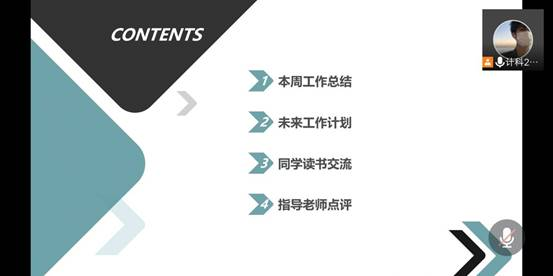 1月16日,信息工程系生涯导师郭伟伟指导四个小组通过腾讯会议联合召开第四学期周总结会,指导教师和14名同学参加,由杨兴哲主持。