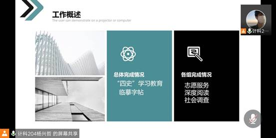 会议从一周工作总结、未来工作计划、学生读书交流、指导教师点评四个方面展开。首先,四位组长汇报了第四学期第一周各组活动开展的总体情况,就学校统一组织的“四史”学习教育、临摹字帖、志愿服务、深度阅读、社会调查进行了分项汇报,交流了第四学期各组活动开展的经验。