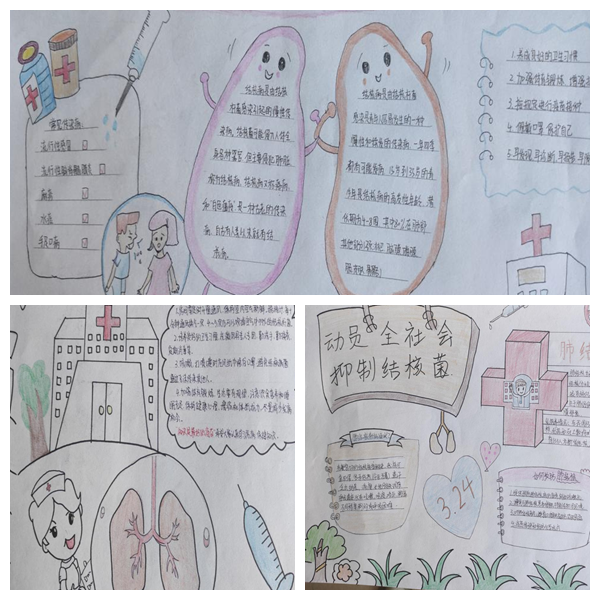 同学们通过手抄报的形式对学校师生大力宣传结核病的防病知识。电商212班宋欣彤同学的作品结合肺结核的相关病情做了板块介绍,生动形象地体现了如何预防结核病;财管211王敏译同学的作品科普了结核病的防治,加深了大家对结核病的了解。