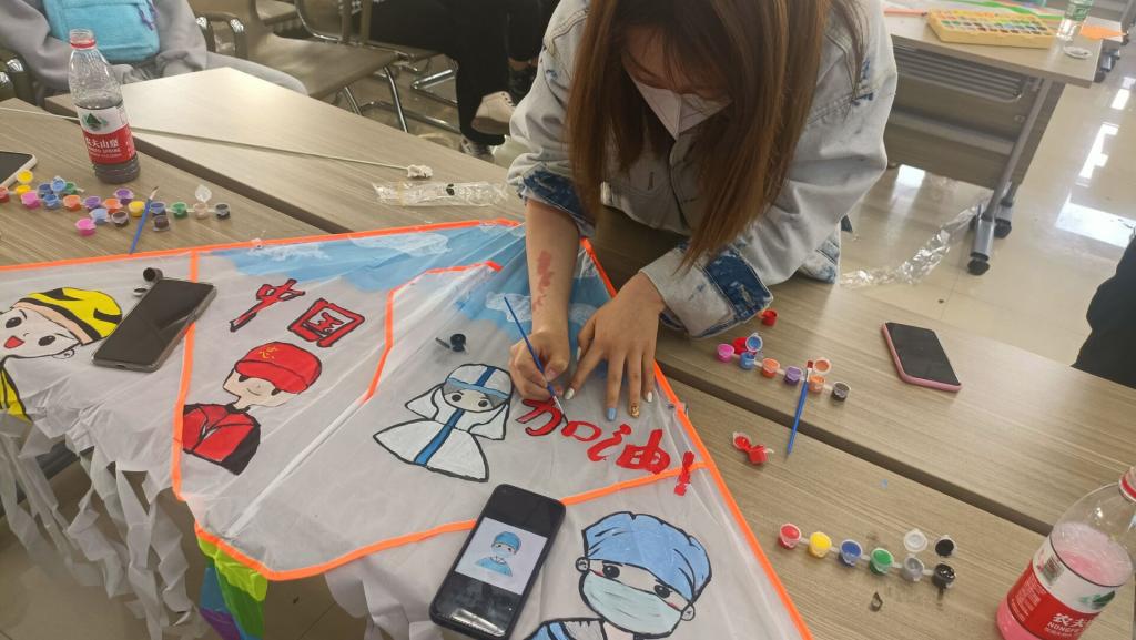 第三组参赛成员在风筝上勾绘出防疫医护人员以及抗疫志愿者的形象,表达着“疫可除,人团圆,举国安”的美好愿望。风筝上红色画笔写上的“中国加油”四个大字分外醒目,充满了战胜疫情的信心。