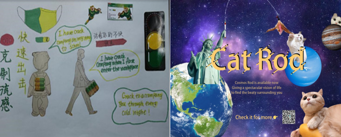 本次比赛先由线上提交的作品照片至学习通,教研室老师再进行统一评选。比赛以团队为单位,2019级全体同学共形成13个团队进行英文海报设计。各团队成员在海报设计中能够做到拓宽思路、集思广益、通力合作,最终通过手绘制作、软件制作等不同形式呈现出了13份英文海报,海报内容涉及到产品推广、书籍推介、公益事业等方面。