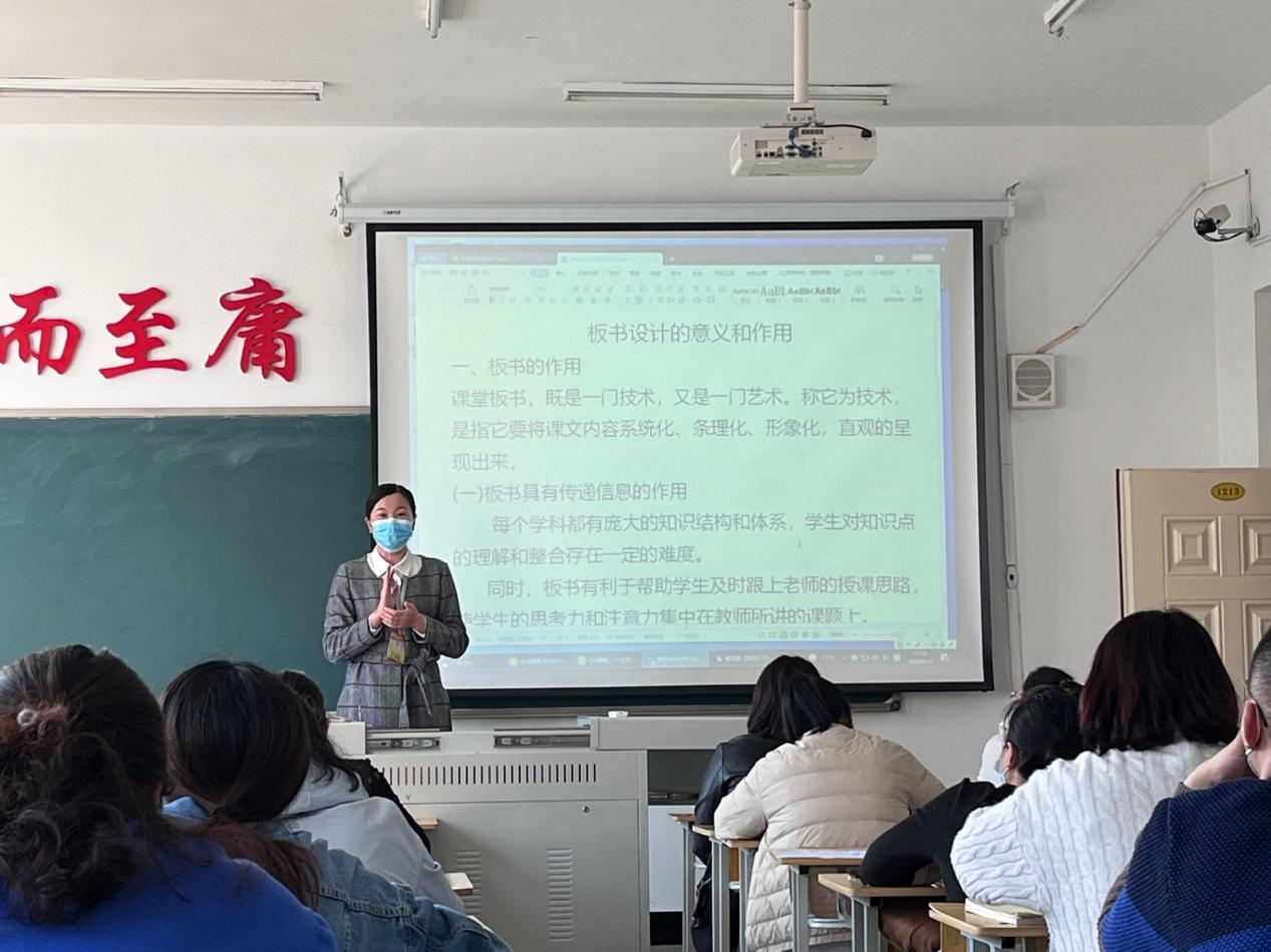培训中,张苗结合学校下发的《关于举办第二届“板书设计”比赛的通知》具体要求,鼓励全体任课教师(含兼课教师)积极参与并按时提交作品。又从板书设计的意义、作用、原则等三个方面做了具体说明。张苗指出,在新媒体教学方式盛行的今天,板书教学仍然是课堂上最有效且不可缺的一部分黑板是教师上课的主阵地,用书写规范、结构合理、设计新颖的板书把教学内容呈现出来,不仅能够吸引学生的注意力,提高学生参与课堂学习的积极性,而且还能培养学生的审美能力,使得学生从教师精美的板书中学习到认真的工作态度和严谨的治学精神。希望全体任课教师能立足本职工作,在课堂教学上结合自己的经验,潜心研究,推陈出新,提高自身板书技能。