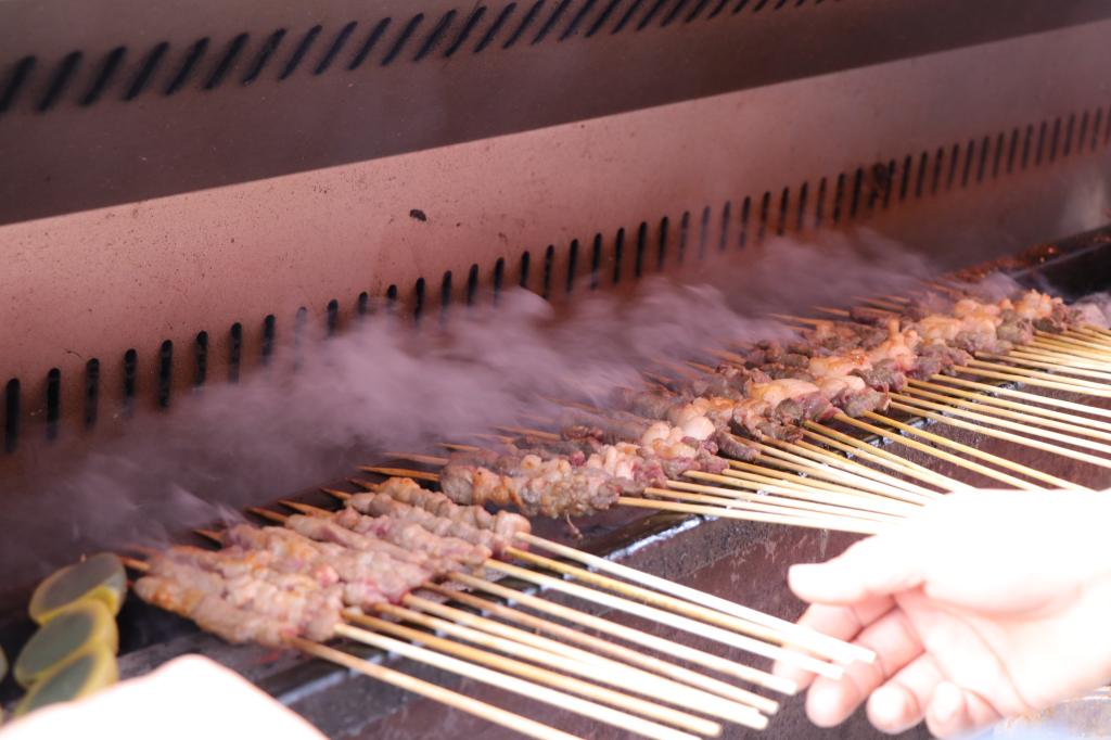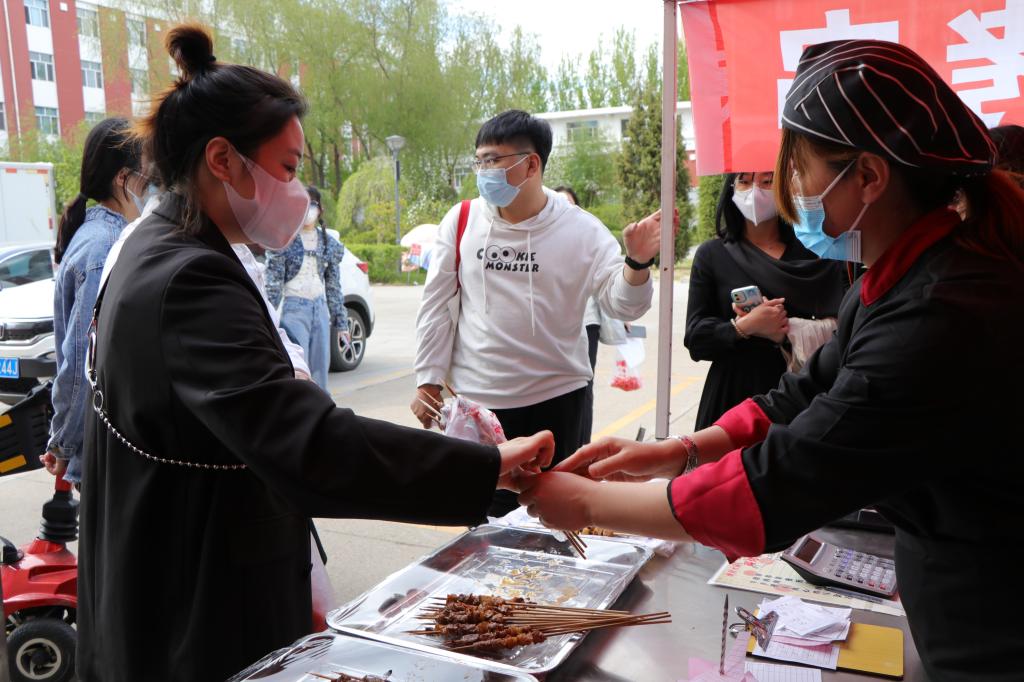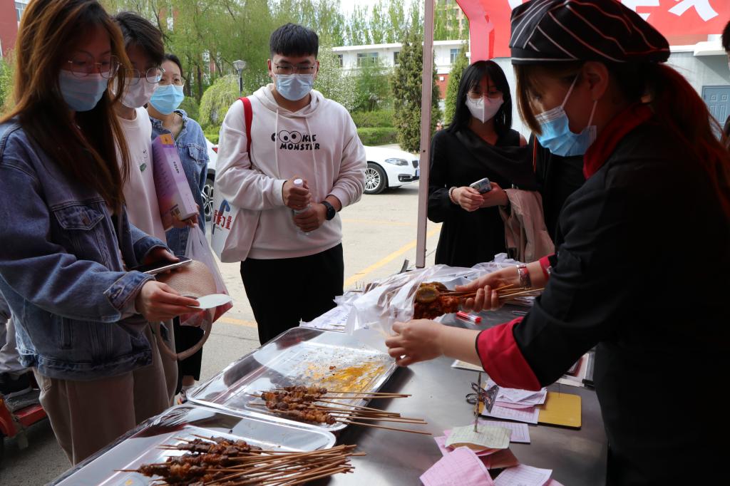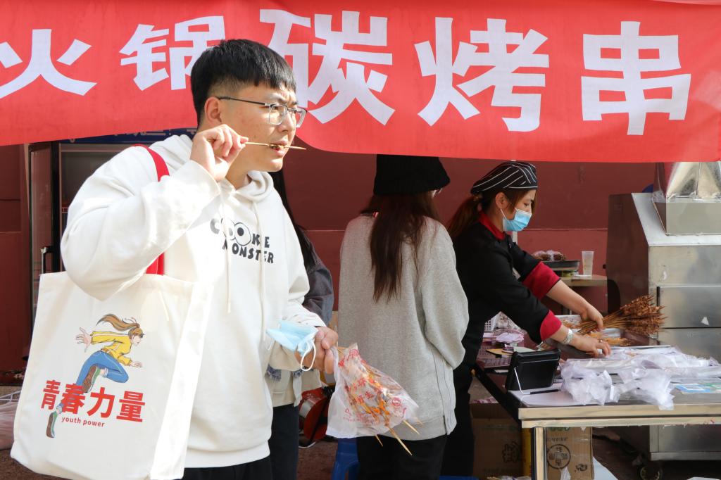 5月14日,学校水果超市楼下飘来阵阵炭火烤肉串的香味。三五成群的同学“寻味”而来,驻足品尝,交口称赞。