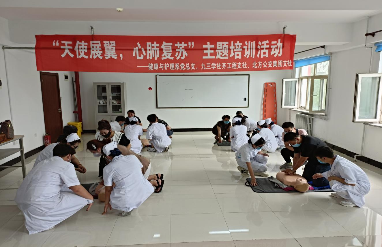 7月6日上午,健康与护理系党总支、九三学社齐工程联合支社、北方公交集团支社代表在学校大健康实训中心三楼联合开展了“天使展翼·心肺复苏”主题培训活动,对49名公交车司机进行培训。系杨兰老师主持本次活动。