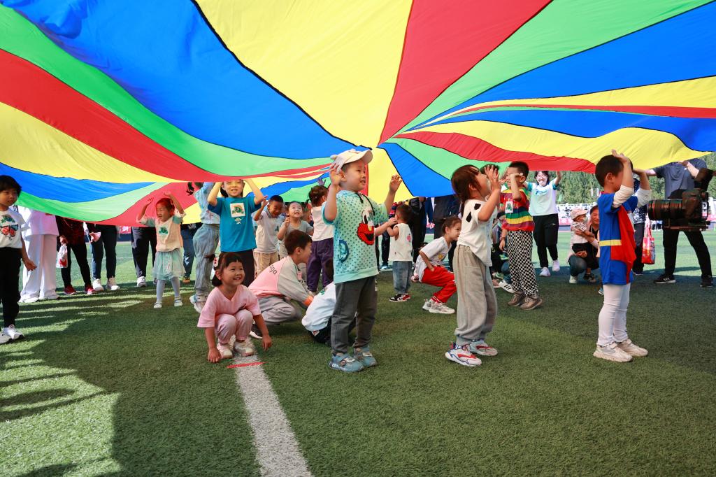 秋风吹叶易湖边,艳阳高照运动场。9月16日,在学校的体育场上彩旗招展,欢声又笑语,2022年秋季田径运动会召开了。特别引人注目的是一支平均年龄4岁近40名的小朋友运动员,他们拉着“教工子弟运动队”的横幅,随着音乐,在家长的陪伴下,大手拉小手欢快地走向运动场中央,参加“比赛”。