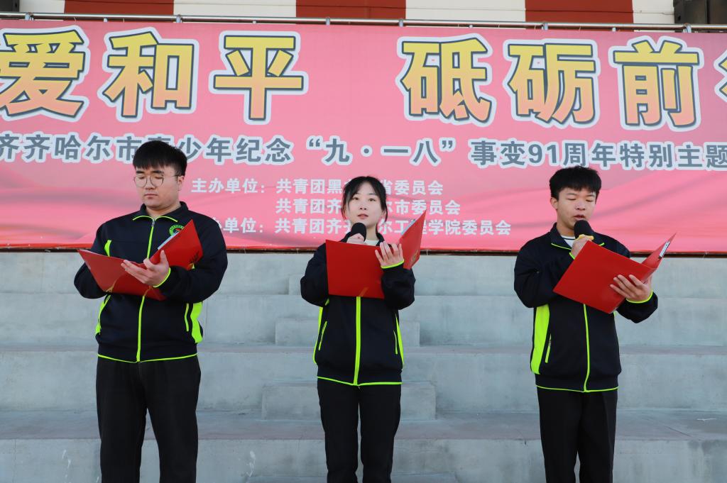 电商201班夏明宇、财管221班孔祥恬、电气191班宫柏轩在国旗下诗朗诵《这盛世如您所愿》。历史的回眸、当下的奋发、未来的可期,他们用饱含深情的声音歌颂伟大的祖国母亲,用真挚的情感祝福伟大的祖国母亲。