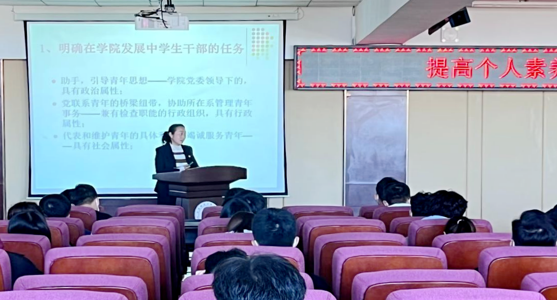 10月18日,机电工程系党总支书记王丽萍为青马骨干作了《提高个人素养 不辱学生干部使命》的讲座,围绕学生干部的工作职责、个人素养展开讲座。她提到,作为学生干部一定要把思想、生活及学习的时间合理分配,要明确“以人为本,服务学生”的根本宗旨,明确在学校发展中学生干部的任务;作为学生干部在工作岗位上要谨记讲政治、顾大局、谋作为、善创造、会协调、惯清廉,发挥先锋模范作用。