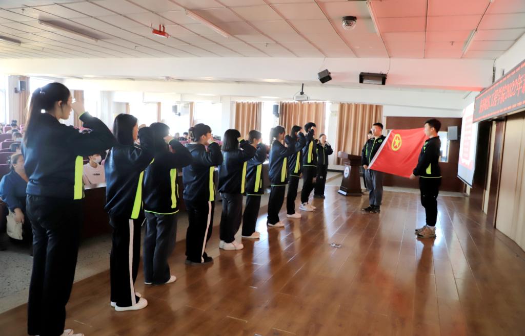 在团委副书记孙宇同学的领誓下,全体新团员面对着鲜艳的中国共青团团旗,举起右拳,庄严宣誓。铿锵有力的声音,彰显了新团员一心向党的坚定决心。