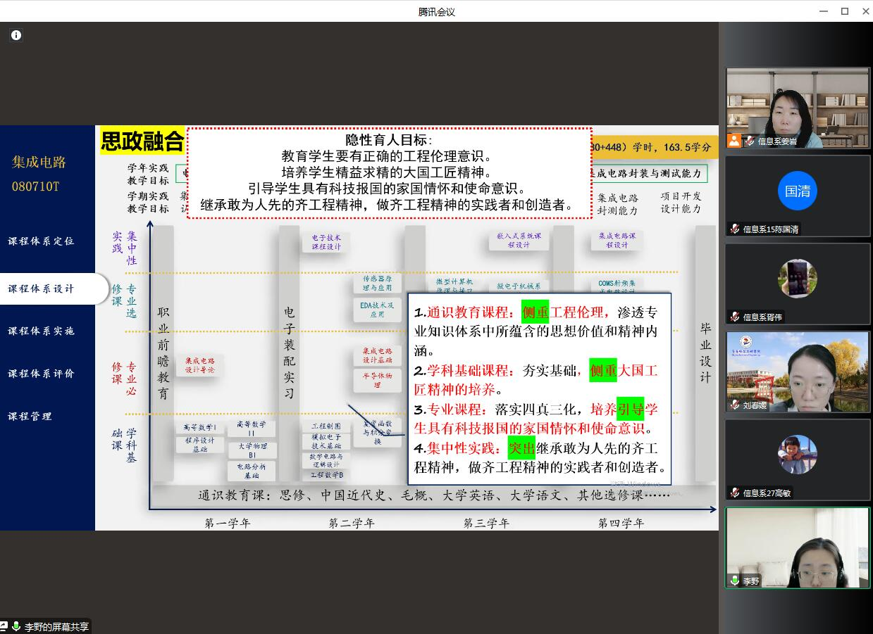 6名专业长和27名教师按照抽签方式决定说课顺序。专业长在说课过程中,从专业课程建设角度出发,运用FT课程建设模式,在专业层面设计与实施课程,引入课程思政,发挥“三总师”的作用;专业教师在说课过程中,从课程入手,完善开课说明。姜岩进行了总体点评:“说课能够围绕课程开发和课程管理,凝练课程思政建设和学科竞赛、双创进行阐述,但还要结合学科和专业特色,深入挖掘和梳理各类课程所蕴含的思想政治教育元素。课件中对人的管理应该再深入谈一谈,课程评价比较单薄,如学生的态度目标是怎样内化于心、外化于形的等。”系副主任刘春媛对此次说课进行了总结:“全体教师说课内容都有所提高,但课件中专业特色不明显,对于三学期有弱化,内容较少;在实际授课过程中,要注重细节,教学要严谨,注意工作态度;态度目标中用词要准确,以课点为单位实施课程思政,注意顺序,在二级矩阵之后再出现课程思政,搞清楚逻辑关系;要有学术规范的意识,同时认真落实专业的要求。”说课验收活动,有助于提高教师的授课方式和课程设计思路,为下一步工作打下良好的基础。