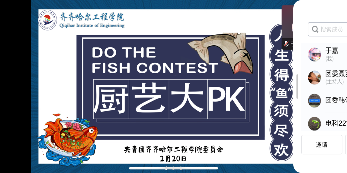 2月20日17点,学校团委在腾讯会议平台举办“人生得‘鱼’须尽欢”云端厨艺赛活动,旨在丰富学生的假期文化生活,培养学生的动手能力。150余名学生通过线上直播观看比赛。