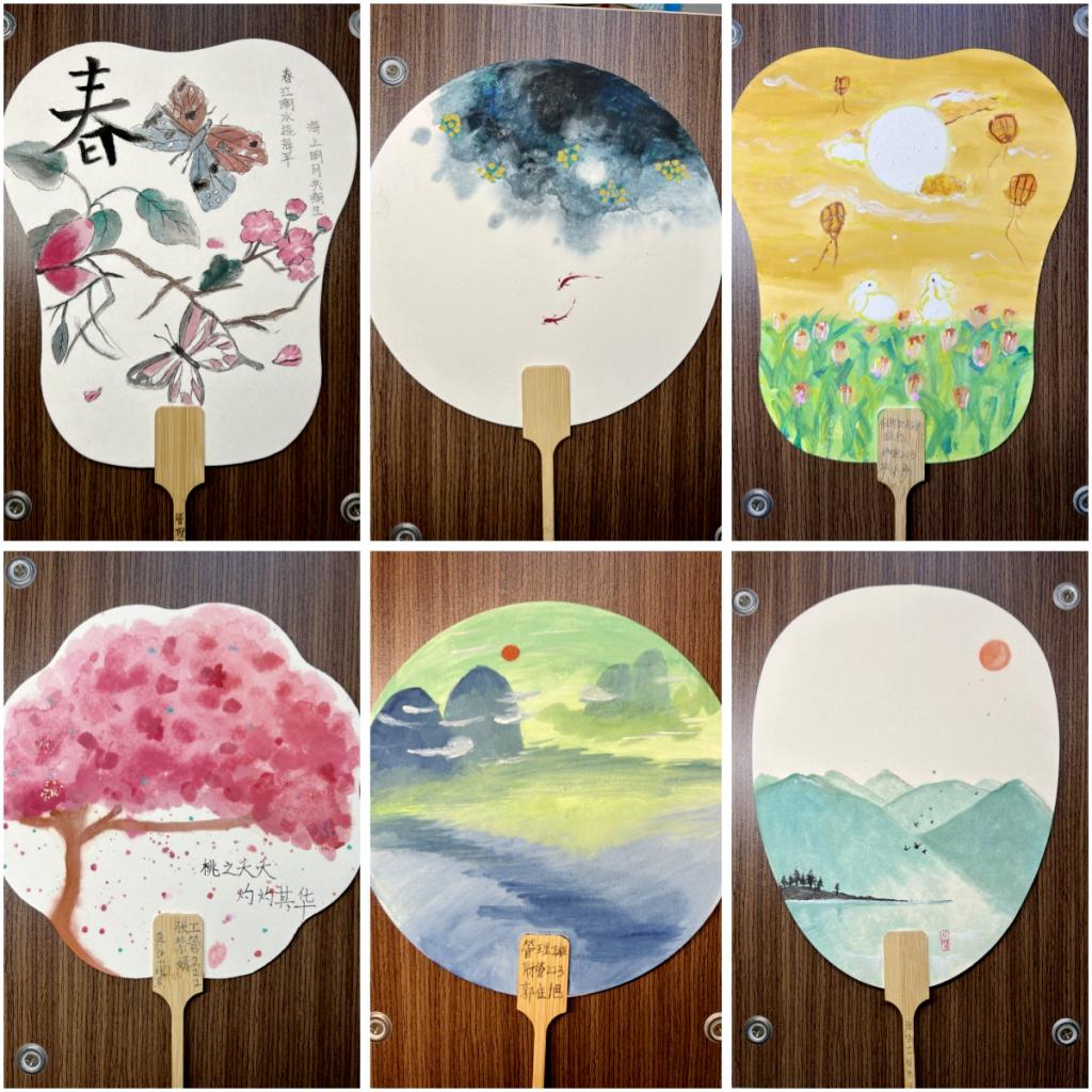 随后,同学们挑选出喜欢的团扇,进行主题创作。经过大家的精心绘制,一把把独具匠心,美不胜收的团扇逐一呈现。