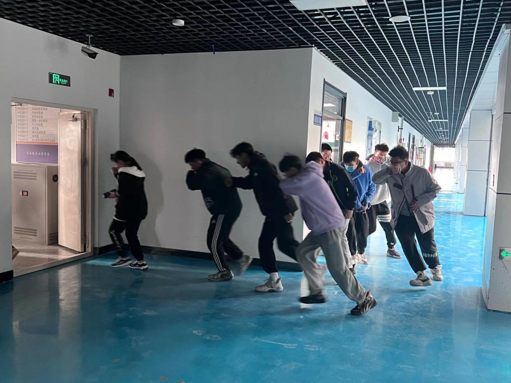 随后,各系师生开始应急逃生疏散演练,学生分别进入到指定实验室内。待火灾发生信号发出后,大家沉着应对,按照规定路线,保持弯腰,距离地面一米以下姿势,遮住口鼻,俯身快速逃离火灾现场。整个演习井然有序,全体师生撤离到安全地带总用时约220秒。