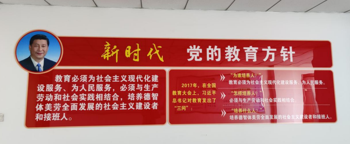 一、二号教学区的宣传板上为教育方针的全文:“教育必须为社会主义现代化建设服务、为人民服务,必须与生产劳动和社会实践相结合,培养德智体美劳全面发展的社会主义建设者和接班人。”