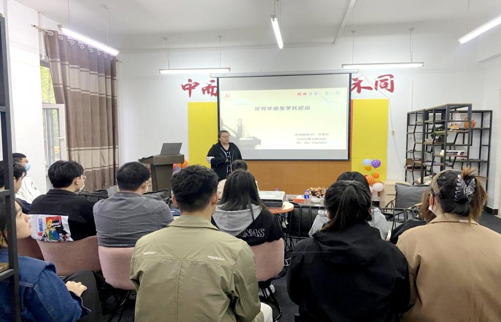 5月12日18时,管理工程系鸿羽讲堂第一期,即优秀毕业生学长论坛正式开讲。现场35人、线上400余人聆听优秀毕业生营销121班乔雨竹同学的十年奋斗故事,辅导员王丽伟老师主持。