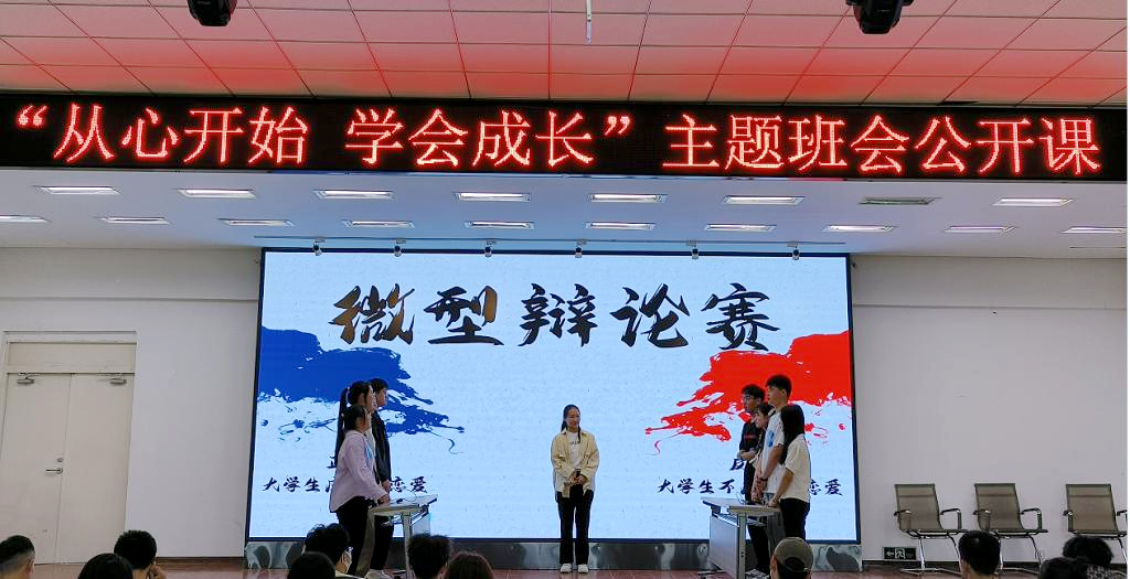 由心理剧第四幕恋爱问题而产生的“大学生应不应该谈恋爱”微型辩论赛现场进行,同学们踊跃参与并积极表达自己的观点:健康的爱情不是肆无忌惮地放纵,不是盲目的跟从,而是互相尊重,是在成长过程中相互扶持,相互激励,在成长的道路上一起携手进步。