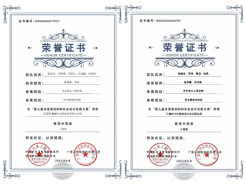近日,由中国土木工程学会建筑市场与招标投标研究分会、广联达科技股份有限公司主办的第九届全国高校BIM毕业设计创新大赛总决赛圆满落幕。建筑工程系徐明与郝丽娜老师,土木工程专业钟美慧与贺全德老师,工程管理专业曲梦露、李俊、梁海、朱同威老师指导的团队在激烈的角逐中获得三等奖五项、优秀奖两项。