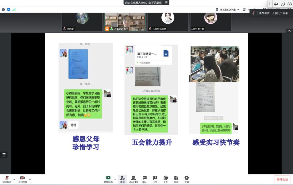 7月22日下午,人事处5位生涯导师组织所带学生召开线上交流会,并邀请计算科学与技术专业2020届毕业生霍欣明学长作成长经验分享。会议由人事处副处长张平主持,计算机科学与技术、视觉传达设计、电子科学与技术、大数据科学与技术专业40余名学生参会。