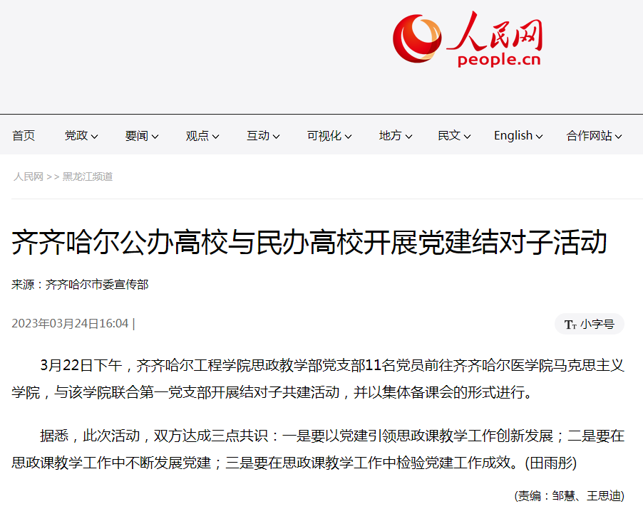 人民网:齐齐哈尔公办高校与民办高校开展党建结对子活动