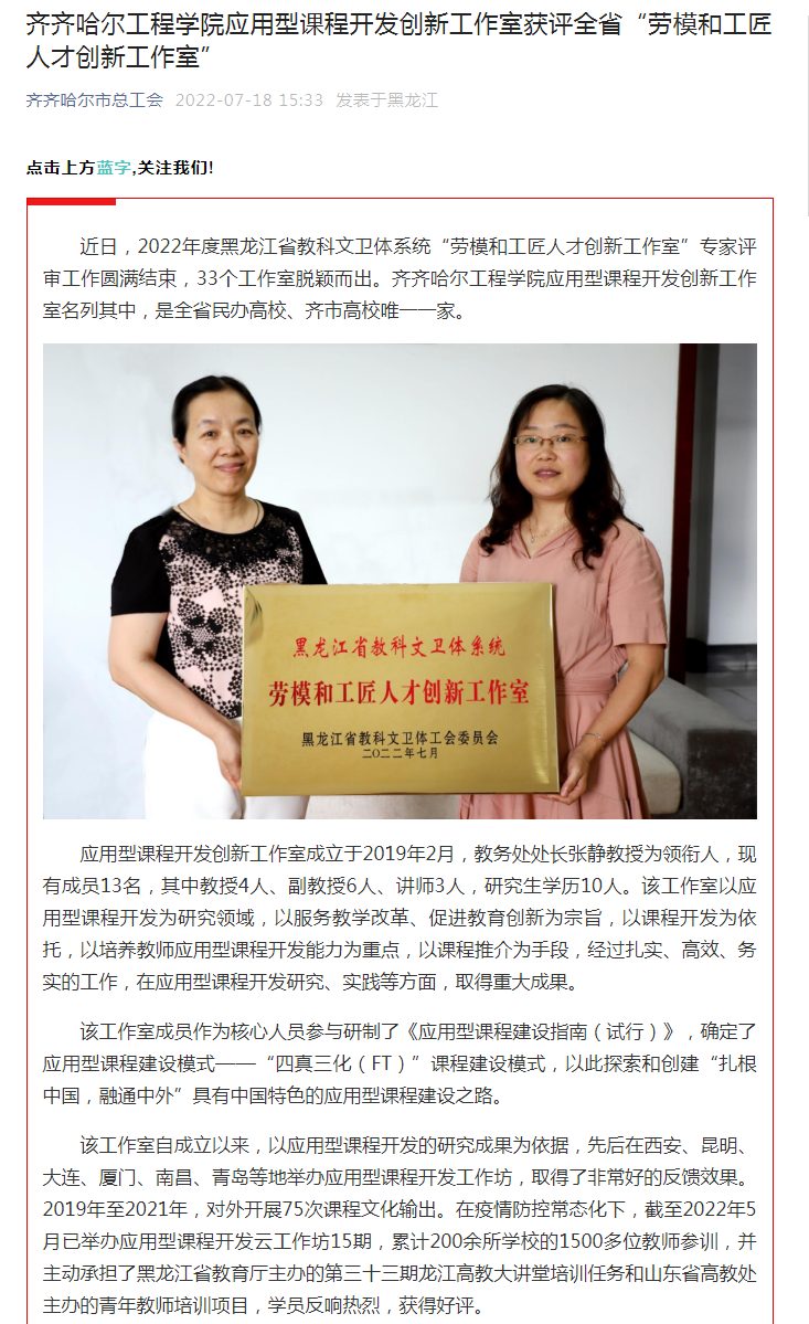 齐齐哈尔市总工会:j9在线应用型课程开发创新工作室获评全省“劳模和工匠人才创新工作室”