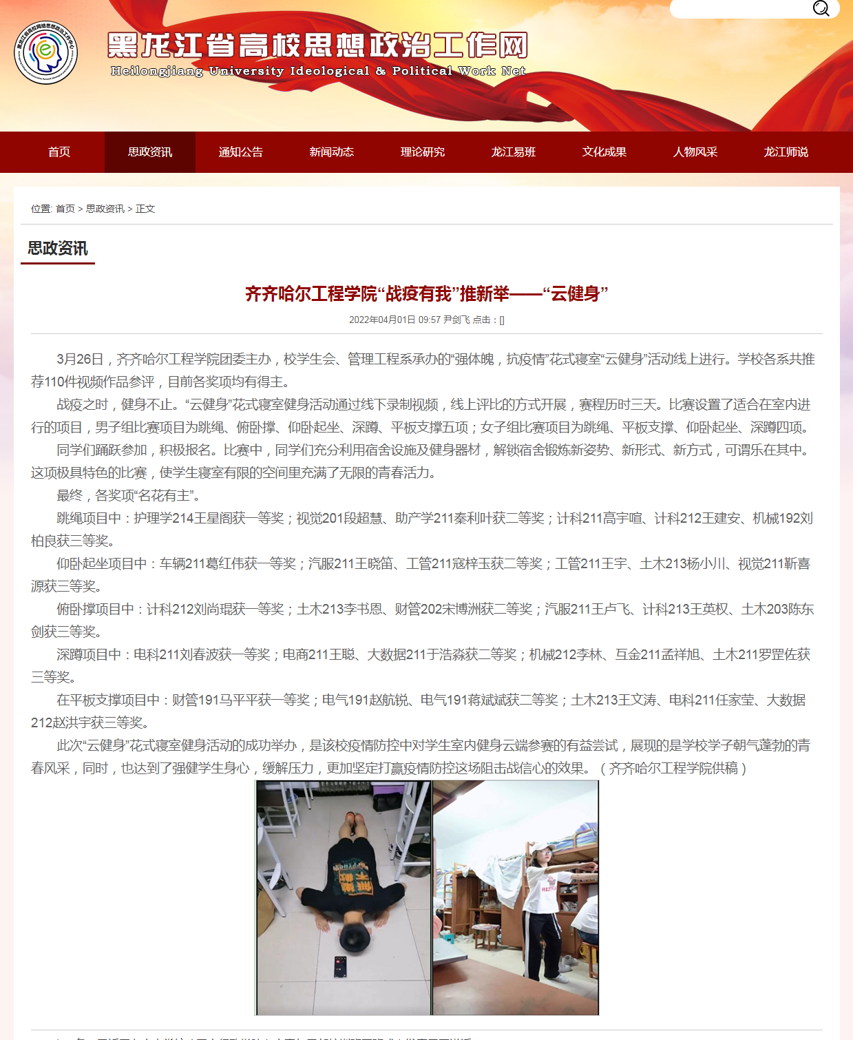 黑龙江省高校思想政治工作网:j9在线“战疫有我”推新举——“云健身”