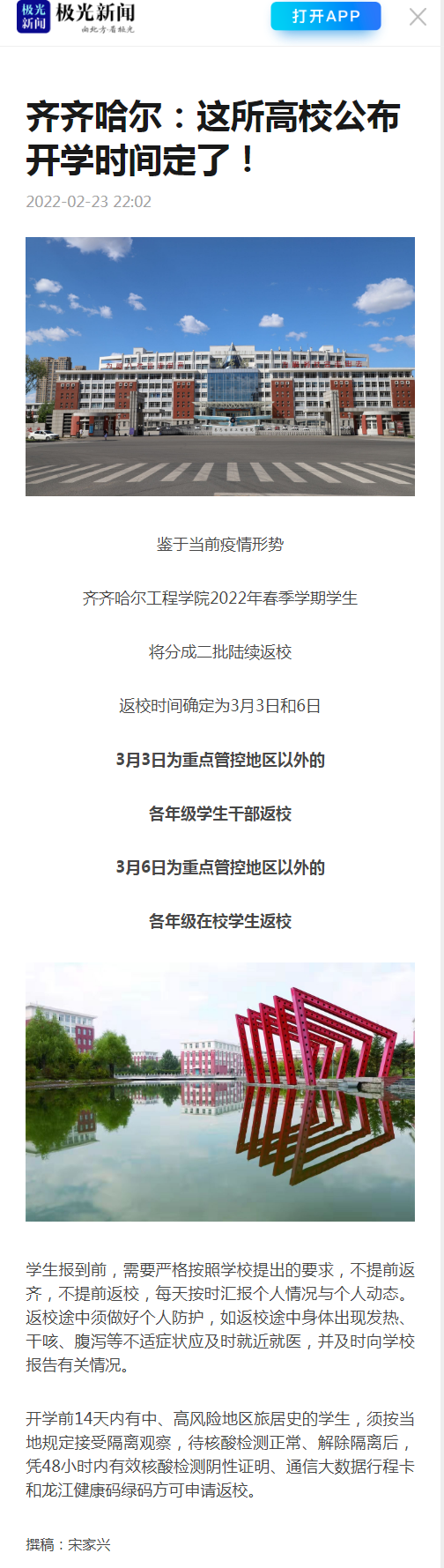 极光新闻:齐齐哈尔:这所高校公布开学时间定了!