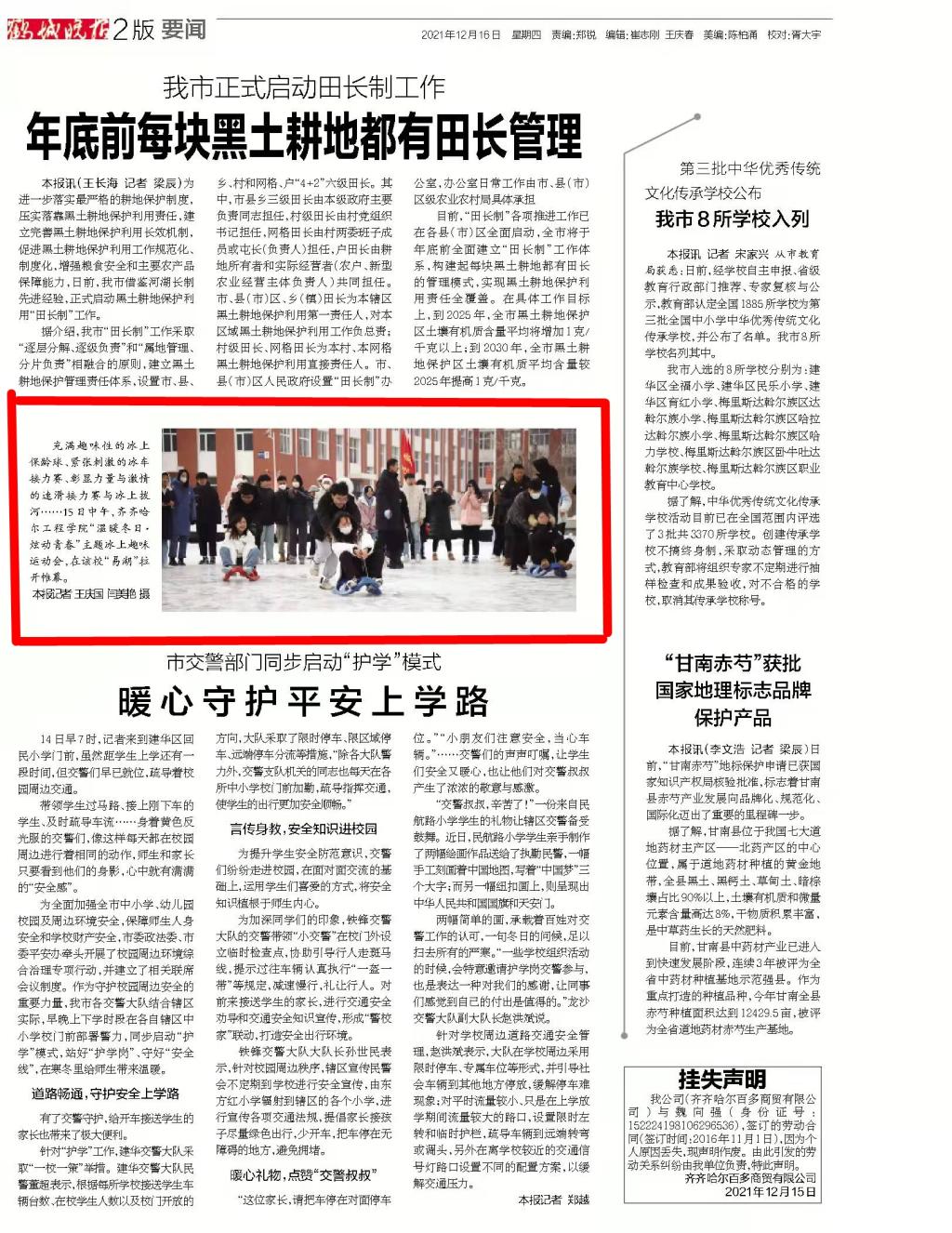 鹤城晚报要闻版图文报道学校冰上趣味运动会