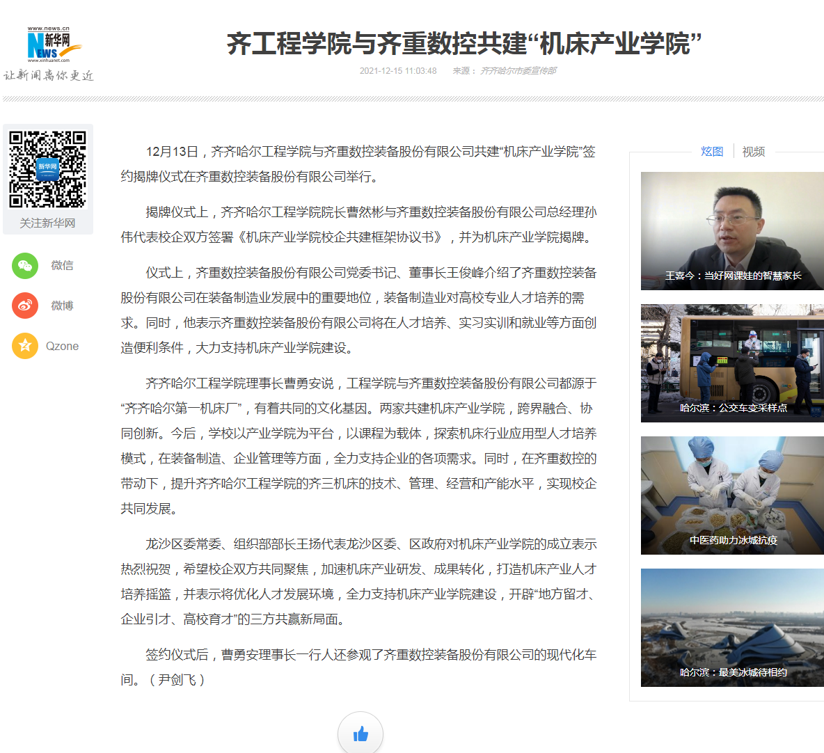 新华网:齐工程学院与齐重数控共建“机床产业学院”