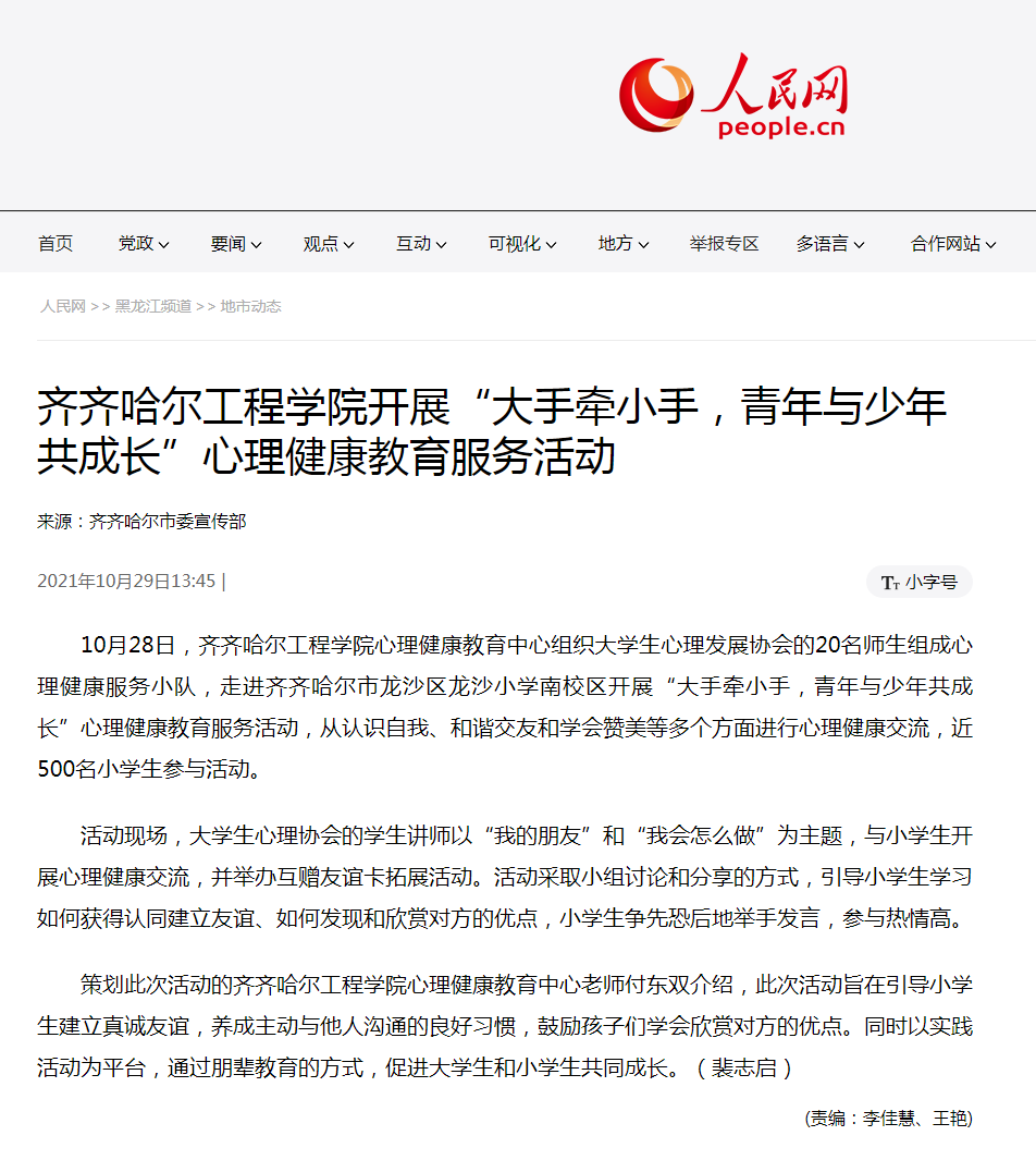人民网:j9在线开展“大手牵小手,青年与少年共成长”心理健康教育服务活动