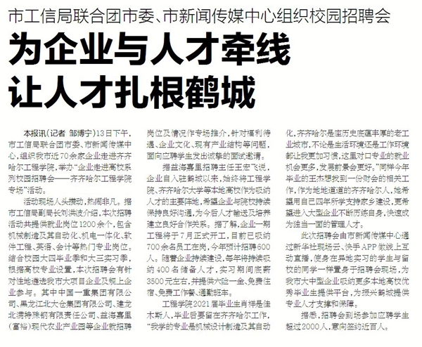鹤城晚报报道“企业走进高校系列校园招聘会——j9在线专场”活动