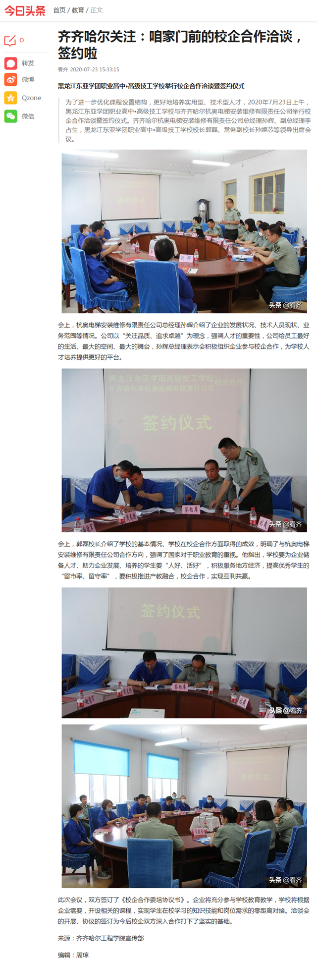 今日头条《齐齐哈尔关注》:咱家门前的校企合作洽谈,签约啦