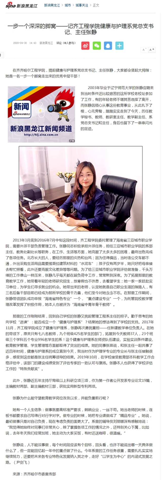 新浪网:一步一个深深的脚窝——记齐工程学院健康与护理系党总支书记、主任张静