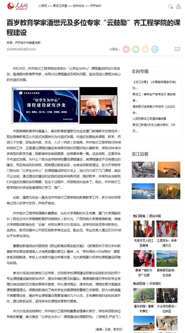 人民网:百岁教育学家潘懋元及多位专家“云鼓励”齐工程学院的课程建设