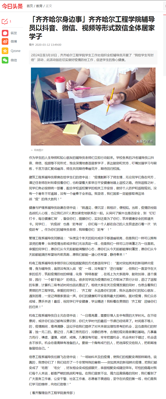 今日头条《齐齐哈尔身边事》:j9在线辅导员以抖音、微信、视频等形式致信全体居家学子
