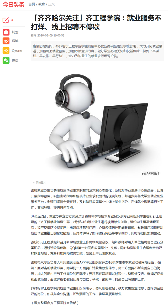 今日头条《齐齐哈尔关注》:齐工程学院:就业服务不打烊、线上招聘不停歇