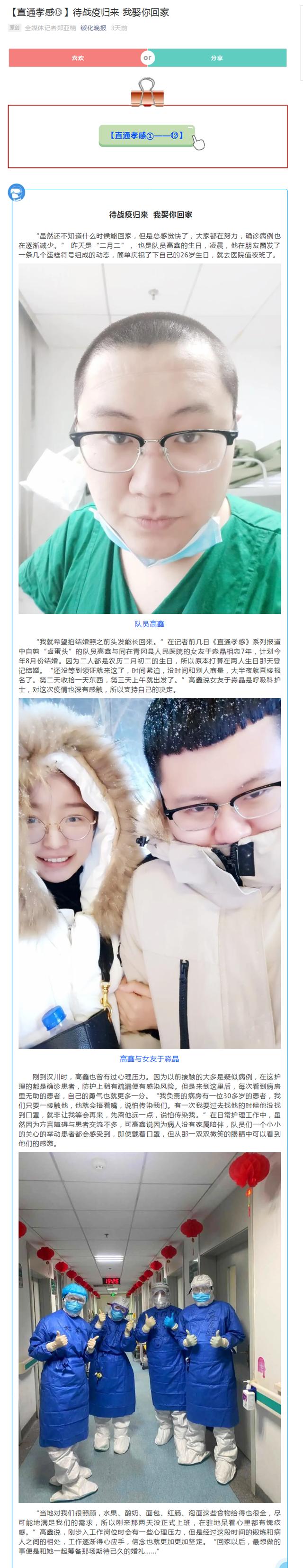 绥化晚报《直通孝感》:待战疫归来 我娶你回家——我校护理学专业毕业生高鑫的故事