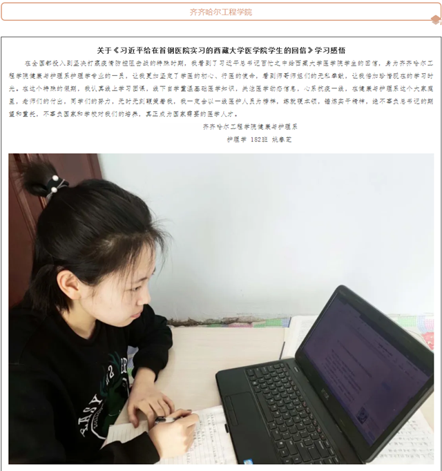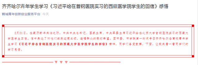 鹤城青年创新创业服务平台:齐工程学院姚春芝同学学习《习近平给在首钢医院实习的西藏医学院学生的回信》感悟