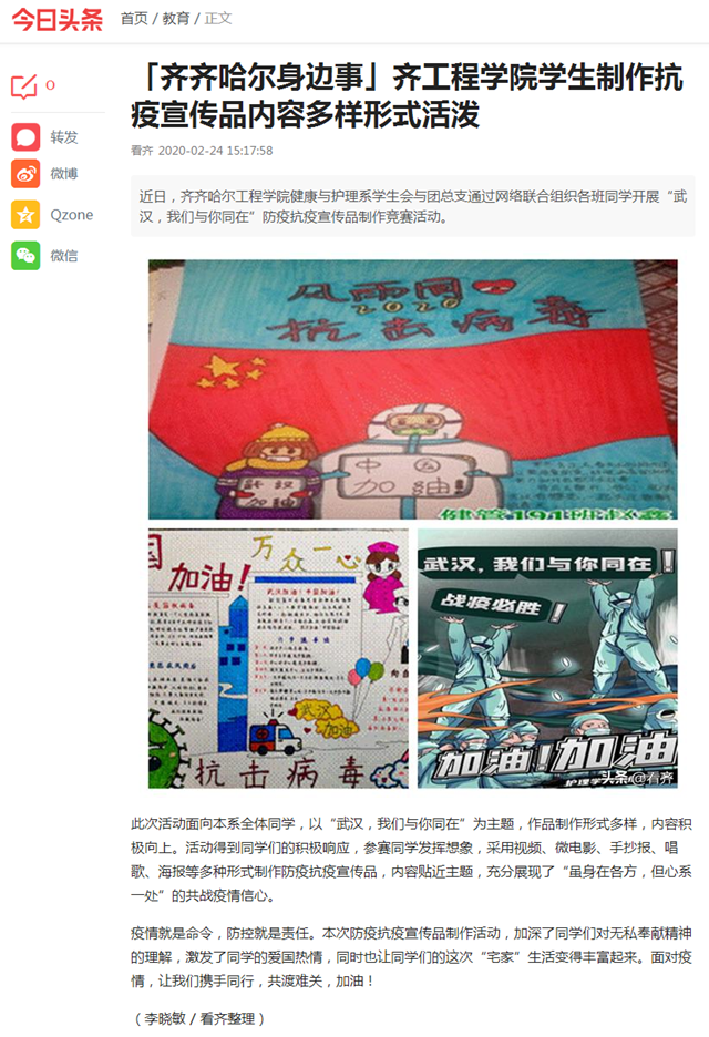 今日头条《齐齐哈尔身边事》:齐工程学院学生制作抗疫宣传品内容多样形式活泼