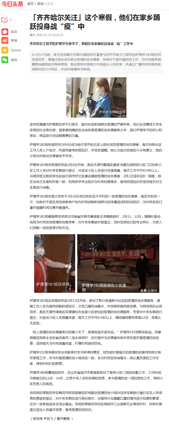 今日头条《齐齐哈尔关注》:这个寒假,他们在家乡踊跃投身战“疫”中