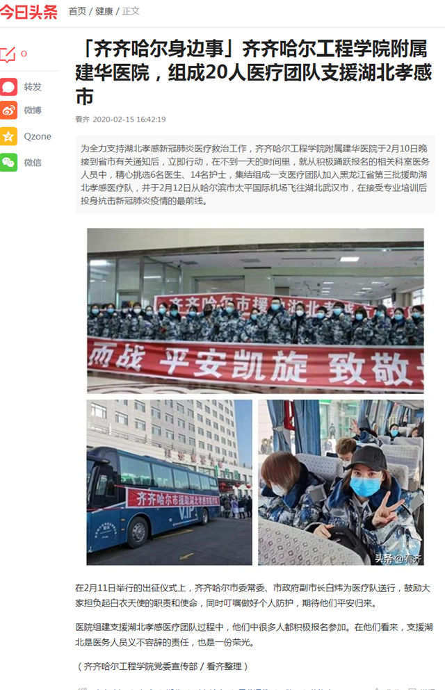 今日头条《齐齐哈尔身边事》:j9在线附属建华医院,组成20人医疗团队支援湖北孝感市