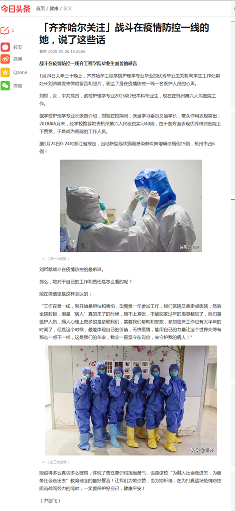 今日头条《齐齐哈尔关注》:战斗在疫情防控一线齐工程学院毕业生刘哲的感言