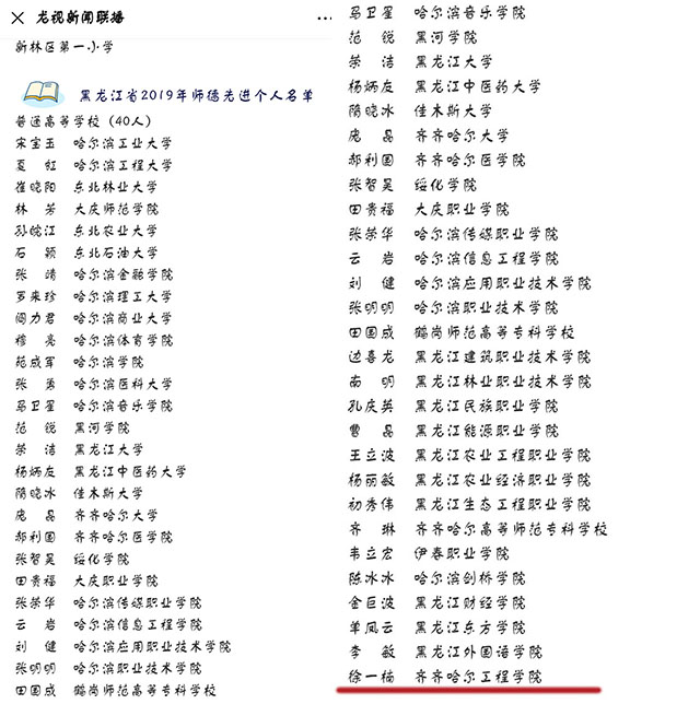 龙视新闻联播微信公众号报道学院教师徐一楠荣获“黑龙江省2019年师德先进个人”称号