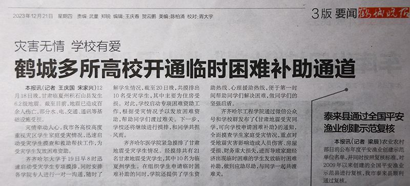 《鹤城晚报》报道灾害无情 学校有爱