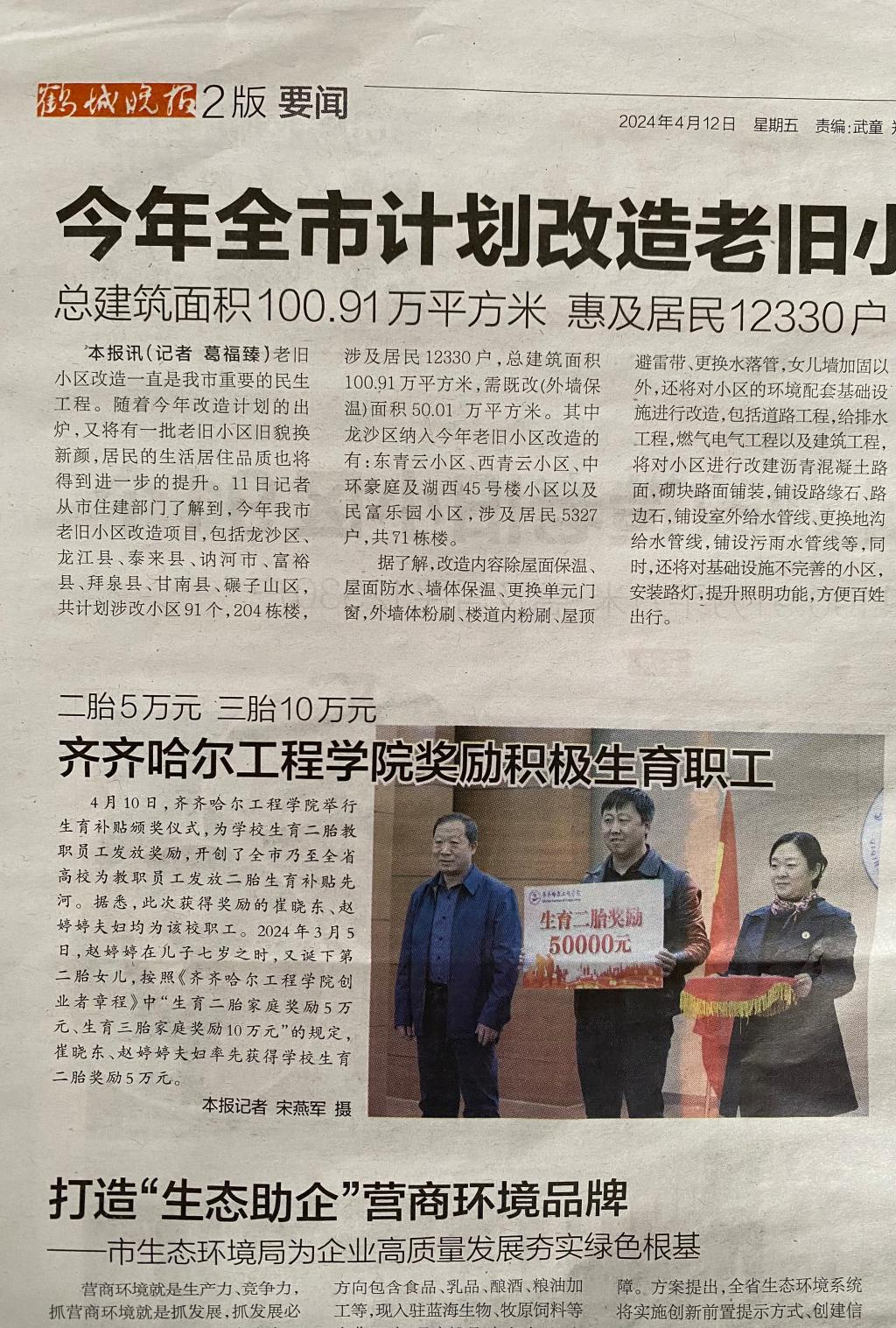 《鹤城晚报》报道j9在线奖励积极生育职工