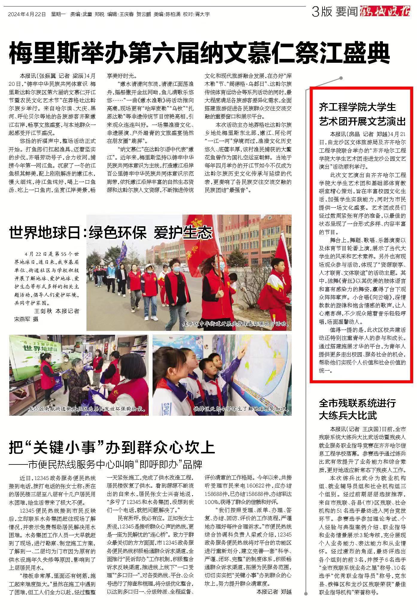 《鹤城晚报》报道齐工程学院大学生艺术团开展文艺演出活动