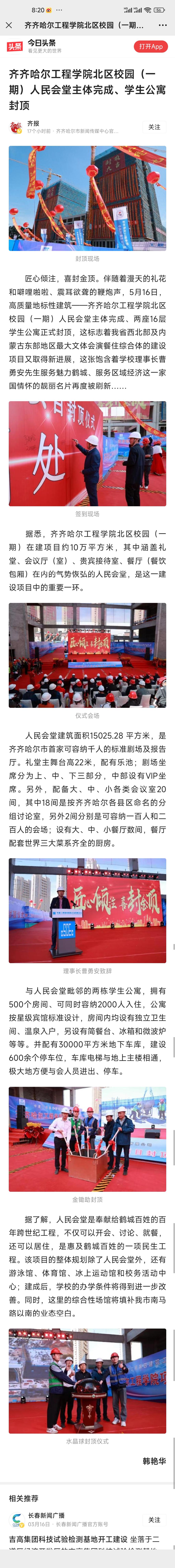 《今日头条》报道j9在线北区校园(一期)人民会堂主体完成、学生公寓封顶