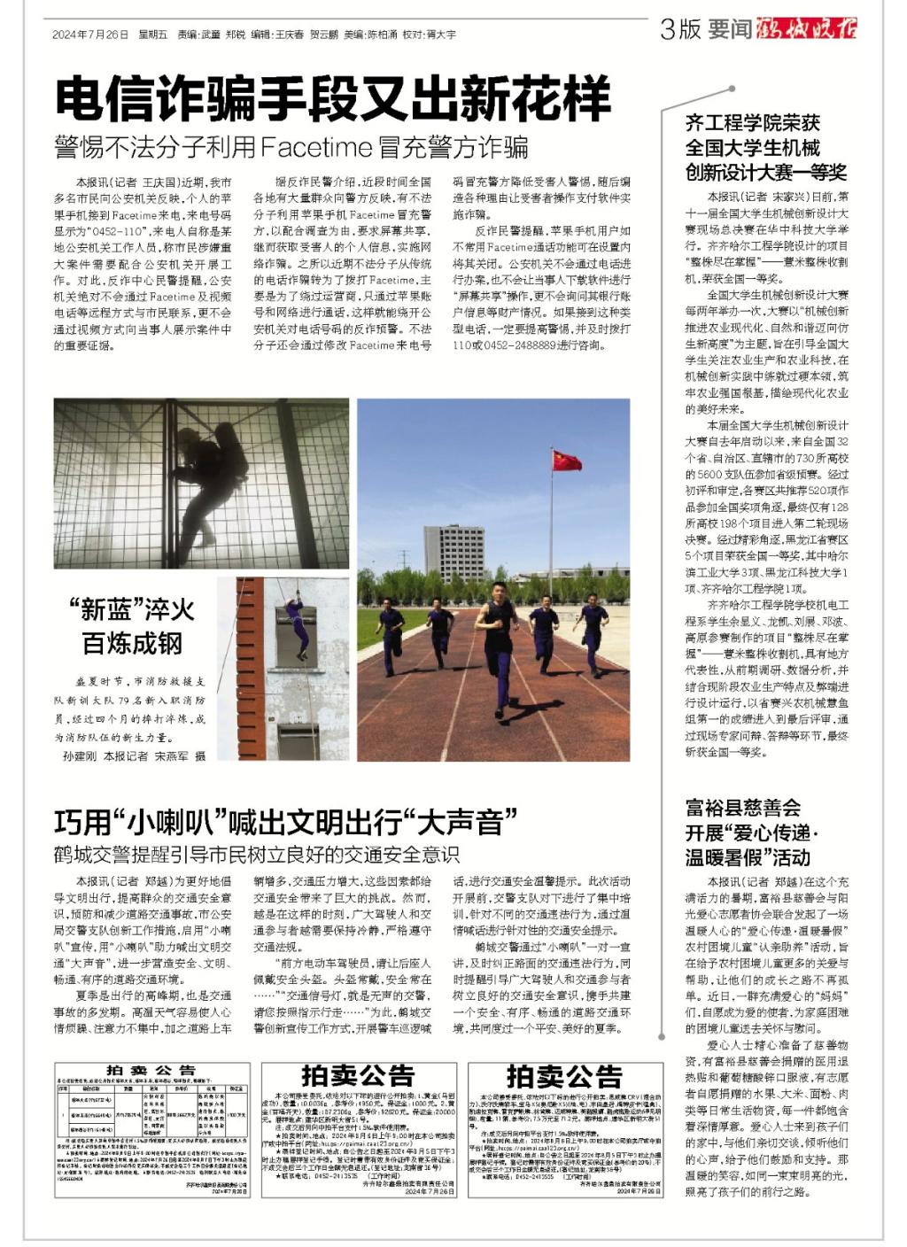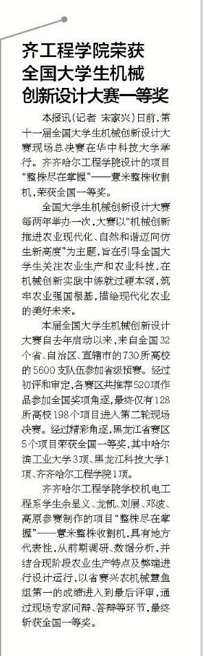 《鹤城晚报》报道齐工程学院荣获全国大学生机械创新设计大赛一等奖