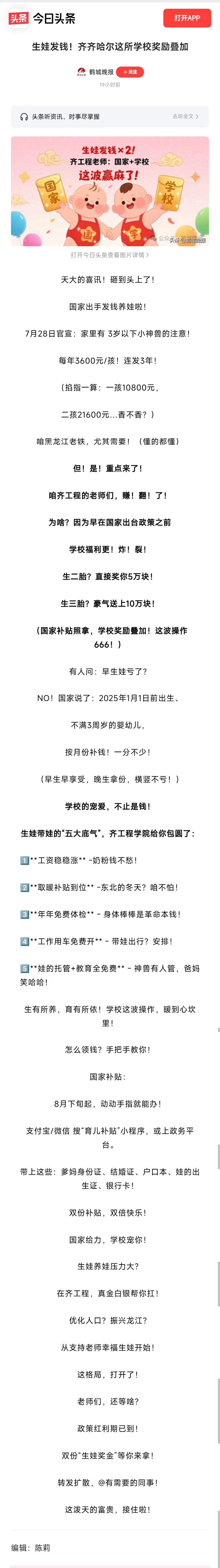 《今日头条》生娃发钱!齐齐哈尔这所学校奖励叠加