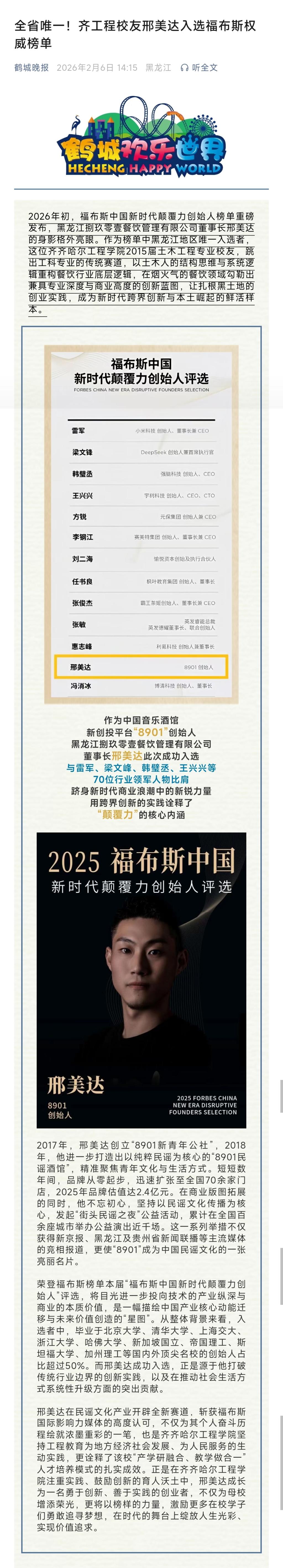 《鹤城晚报》全省唯一!齐工程校友邢美达入选福布斯权威榜单