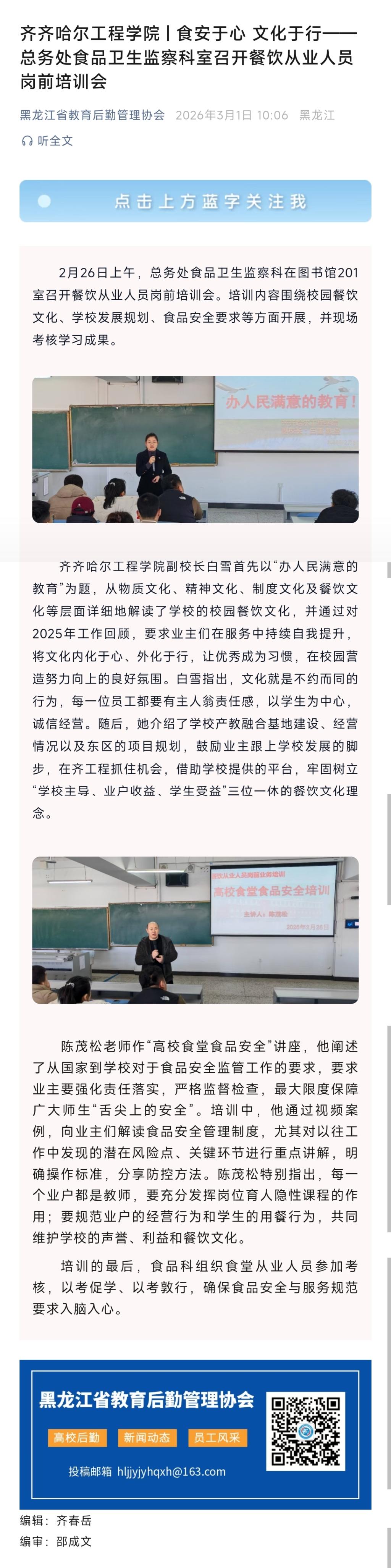 《黑龙江省教育后勤管理协会》j9在线 | 食安于心 文化于行——总务处食品卫生监察科室召开餐饮从业人员岗前培训会